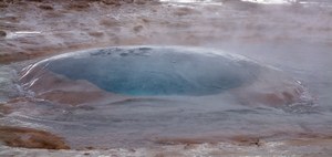 Een stukje terug ligt de bekendste attractie van IJsland, de geisers. Eigenlijk is het er nog maar één. De beroemde Geysir, waarvan de naam geiser is afgeleid, is uitgedoofd. Alleen als er zeepsop in het gat wordt gegooid laat hij nog zijn kunsten zien, maar dat wordt alleen nog maar gdaan als er een staatshoofd op bezoek is. Een stukje verderop is IJslands enige overgebleven geiser wel aktief. De Strokker is niet zo groot, maar spuit wel elke 5 minuten. We zien hem dus een aantal keren uitbarsten. Het blijft een heel speciaal natuurfenomeen. In het verrassend kleine geiserbassin zien we nog een paar kleurige poeltjes en gaten waar alleen stoom uit komt.