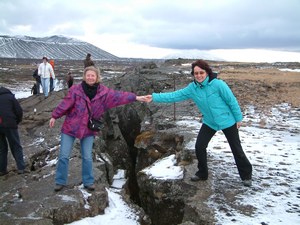 Hierna rijden we via een klein paadje langs een grote afgeplatte vulkaan naar een onderaards riviertje. Door de thermische werking is het water zo warm dat je er in zou verbranden. Op deze plek zien we ook een kloof in de aardkorst. Met enige verbeelding kun je stellen dat je aan de ene kant op Amerika staat en aan de ander kant, een metertje verder, op Eurazië.