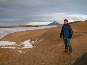 Akureyri ligt aan het eind van een 60 km diepe fjord op de plaats waar de rivier in de fjord uit mondt. We steken de rivier over en rijden over een licht besneeuwde pas in de richting van Myvatn. Ook in IJsland is het weer van slag. Normaal gesproken ligt hier 2 meter sneeuw, maar nu is dat niet meer dan een dun laagje waar de ondergrond doorheen komt. Op zich wel erg mooi. We noemen het een 'Bob Ross landschap', naar de schilder die dit soort landschappen vaak schildert.