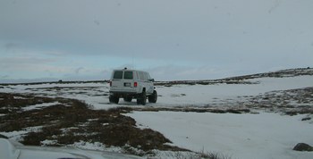 Wij zitten samen met Peter en Mariette in een auto, de rest is de wat grotere Ford. We rijden langs het bevroren Myvatn meer naar het noorden. Hier slaan we af bij een weg die voor het gewone verkeer afgesloten is. De weg is inderdaad slecht en soms onder de sneeuw verdwenen. Het landschap is vulkanisch en bijzonder ' ruig'.