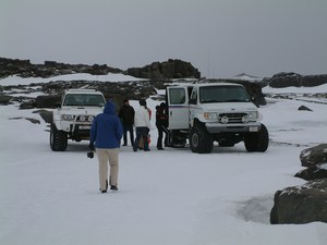 Om 10 uur staan de 2 auto's klaarvoor vertrek. Het zijn een Nissan en een Ford, die op gigantisch hoge wielen staan. In deze tijd ligt er normaal gesproken 2 meter sneeuw en dan heb je deze auto's echt nodig. Nu is het een makkie voor ze.