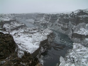 Een stukje stroomafwaarts ligt de derde waterval van de rivier Jokulsa a Fjollum. Wat een naam. De waterval heet Hafragilsfoss, ook al een naam die je lang bij blijft. De waterval mondt uit in een schitterende canyon en biedt ons het mooiste uitzicht dat we tot nog toe in IJsland hebben gezien. Adembenemend, vooral in dit winterse landschap. Vanaf de steile canyonrand kunnen we er ondanks de ijzige wind geen genoeg van krijgen.