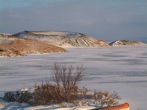 Na een prima ontbijtje pakken we ons helemaal in en doen de wandeling die vanaf het hotel begint. Hier liggen een aantal kleine uitgedoofde vulkaarkraters van enkele meters hoog. Er waait een straffe koude wind als we het hotel verlaten. De uitzichten maken meteen alles goed. Vanaf de kleine kraters heb je een schitterend uitzicht over het bevroren meer, waar aan de andere oever verschillende grote vulkanen opreizen. Het ijs is verrassend sterk en we zien een grote auto van de ene kant naar de andere rijden. Af en toe laat de zon zich even zien en kunne we prachtige foto's maken. Veel groepsleden maken vanmorgen dezelfde wandeling. Ieder in zijn eigen tempo, maar we komen elkaar telkens weer tegen. Best we’ll gezellig. Op het verste punt kun je op een aantal lavablokken het meer schitterend zien liggen. Echt genieten. Op de lava hebben zich aan een kant korstmossen opeengestapeld. Als je oog hebt voor details zie je de kleine plantjes vechten voor een plekje in de zon.