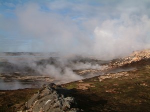 Na de Blue logoon rijden we naar het puntje van het schiereiland. Hier bevindt zich een thermisch actief veld. De activiteit is momenteel zo groot, dat je door de stoomwolken het veld nauwelijks kan zien. Je hoort het vanachter het gordijn pruttelen en spetteren, maar echt zien lukt helaas niet.