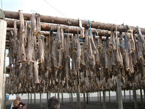 Op de terugweg stoppen we nog even bij een visdrogerij. Hier wordt kabeljauw in de buitenlucht gedroogd. De vissen hangen aan een touw in een hekwerk. De koppen van de kabeljauw worden apart verhandeld. Ze gaan allemaal naar India, waar er soep van wordt gemaakt. Door de vorst zijn de vissen keihard. Heel apart. Hierna snellen we terug naar Reykjavik. Volgens Margot is de tijd op die ze door Djoser wordt betaald. Wat een muts. Volgens Martin, die hier al vaker is geweest, hebben we nu een paar mooi plekjes over geslagen.