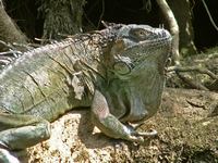 Na de fantastische wandeling rijden we weer terug en relaxen even heerlijk in het zonnetje op het gras voor ons huisje. In ons poeltje woont ook een kleine krokodil. Die ligt ook lekker te bakken in de zon en let niet op de mensen om hem heen. 's Avonds zie ik een koe met kalfje naast ons huisje. Na een tijdje kijkt Ien eens goed en ziet dat het een hertje is. Het dier loopt als een kalfje om de koe en denkt zo niet op te vallen. Het avondeten in het 'restaurant' (zeg maar kantine) was weer net zo smakeloos als gisteren. De tent zit bovendien afgeladen met vakantie vierende groepen. Morgen gelukkig weg. |