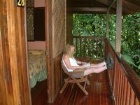 Even na lunchtijd zijn we in de Selva Verde lodge die ik vanmorgen telefonisch voor een paar dagen heb geboekt. De beschrijving is veelbelovend, maar we schrikken ons rot als de lodge aan een voor Costa Ricaanse begrippen drukke weg ligt. De schrik is snel over als we binnen zijn. Een schitterende lodge midden in het groen. We hebben een prachtige kamer. Blokken van vier kamers zijn met loopbruggen met elkaar verbonden. Om een eventuele overstroming aan te kunnen staan ze op palen. Op het terrein zijn alle routes overdekt. Je kunt alle kanten op wandelen op het groot lijkende complex. We vinden het zo leuk dat we meteen een extra nacht boeken.