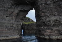 Tijdens de tocht naar Mykines varen we langs de steile kust. De golven hebben soms diepe grotten in de bergen gevormd, waar je met de boot soms helemaal in kan. In het water zien we de eerste papegaaiduikers. Het laatste stuk naar Mykines is heftig. Harde wind en regen. We vrezen het ergste. Als we aankomen is het zowaar droog em ook de wind valt hier mee. Met een ´gids´ kun je in drie uur naar de vuurtoren klimmen. Iedereen loopt echter in zijn eigen tempo en de gids hebben we na de eerste klim niet meer gezien. Is ook niet nodig, want het pad is duidelijk. Gelukkig zijn we er op voorbereid dat er nog maar weinig papegaaiduikers zijn. Pas na een paar heuvels komen we de eersten tegen. Ze zijn erg schuw en duiken na aankomst meteen het nest in. In Schotland zaten we er vlak naast en hoewel we genieten van de grappige vogels hadden we ons er meer van voorgesteld. Papegaaiduikers hebben twee holen. Eentje voor de jongen en eentje voor de uitwerpselen. Zo blijven ze mooi schoon.