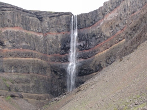 We moeten extreem vroeg op. De boot komt 9:30 aan, maar we moeten om 6:30 al uit de kamer. Net als voor de aankomst in de Faroer is het een chaos. Mensen hangen en liggen met de bagage urenlang op de gang. Om 5:30 op dus en met alle babage naar de ontbijtzaal. Op zich een prima ontbijtje. Op dek 8 kijken we buiten naar de aankomst in IJsland. Het is bewolkt, maar rustig. We varen naar het uiteinde van een fjord naar Seydisfjordur. Hoge, met plukjes sneeuw bedekte bergen begroeten ons. We hebben er zin in !! Het ontschepen gaat lekker snel en we zijn al vroeg in ons hotel in Egilsstadir. Onderweg zien we de eerste van waarschijnlik zeer vele watervallen. In IJsland is het weer een uurtje vroeger en dus twee uur vroeger dan Nederland. Snel de grote bagage gedropt in het hotel en meteen op stap. De papegaaiduikerrots