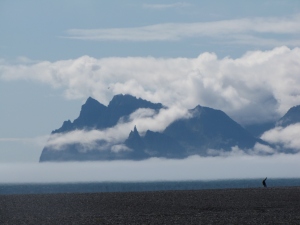 Een paar kilometer verderop is één van de verborgen juweeltjes van IJsland, de Fjadrargljufur canyon. Een klein pad leidt je naar de ingang van de kloof,waar je al een prachtige doorkijk hebt. Een korte klim langs de bovenkant brengt je naar nog mooiere uitzichtpunten. Ondanks de regen een geweldig uitstapje. Zwarte strand van Vik Vik ligt op de zuidwest punt van IJsland. Het strand is pikzart (lava). Er zijn hier prachtige uitzichten en aparte rotsen. Goed te zien bij mooi weer, maar als we aankomen stormt en regent het. De van de ansichtkaarten bekende rotsen zijn in nevelen gehuld. Ien voert een vergeefs gevecht met de wind en haar paraplu valt in delen uiteen. Voordat de paraplu in flarden uiteen werd hij uit mijn hand geblazen en moesten we er rennend achterna. Dit tot grote hilariteit van de vele toeristen die net als wij het weer hebben getrotseerd.