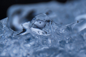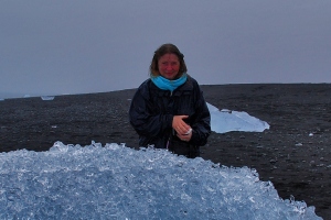 Aan de andere kant van de brug zijn vandaag veel ijsschotsen aangespoeld. Van top tot teen gehuld in regenkleding gaan we er naar toe. Er liggen een groot aantal kleine ijsbrokken. Ondanks de kou, regen en wind lopen we nog een stukje verder over het zwarte strand naar wat grotere ijsschotsen. We worden beloond. Om het hoekje liggen echt grote brokken ijs. Ze hebben hele grillige vormen. Heel apart om dit van dichtbij te bewonderen. De wind en regen jaagt ons uiteindelijk toch terug naar de auto.