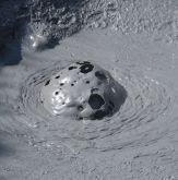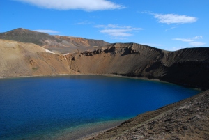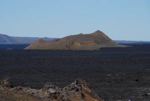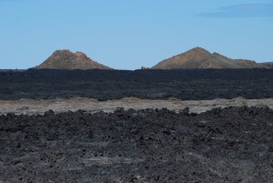 Het Kefla vulkaangebied Niet ver van Hverir ligt het vulkanische gebied van de Kefla vulkaan. Hier hebben zich gigantische erupties gedaan die een enorm lavaveld hebben gevormd met een doorsnede van 25 km. De eruptie van 1724 leverde de Viti krater op. Viti is nu een diepe en steile krater met een doorsnede van 320 meter, gevuld met blauwgroen water. In een kwartiertje kun je een rondje over de kraterwand lopen. In het gigantische zwarte lavaveld zijn prachtige routes uitgezet, waarbij je soms over de grote lavabrokken moet klauteren. Heel apart en ook wel een beetje angstaanjagend. Wat moeten hier enorme krachten zijn vrijgekomen. Niet te bevatten. We maken een lange wandeling door het gebied. De koude wind heeft vrij spel waardoor het ondanks de felle zon koud is.