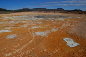 Pastelkleurig thermisch gebied van Hverir Na een heerlijke ontbijtje rijden we van Husavik naar het prachtige gebied rondom het meer van Myvatn. Als eerste bezoeken we het pastelkleurige thermische gebied van Hverir. Het één van de grootste solfatarenvelden van IJsland. Het gebied ligt bezaaid met stoompluimen, fumarolen en kokende modderpotten. Een fumarole is een opening in de aardkorst in een vulkanisch gebied waar hete zwavelhoudende gassen ontsnappen. Het is één van de bekende fotoplekjes van IJsland. Bussen rijden af en aan. Wat een tegenstelling met de winter van 2007 toen we de enigen in dit maanlandschap waren.