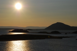 Naar de boot Het is nog 170 km naar de boot in Hirtshals. We moeten er 13:30 zijn, twee uur voor vertrek. Het is onderweg noodweer, maar eenmaal bij de boot worden we door een flauw zonnetje verwelkomd. Het is passen en meten om iedereen aan boord te krijgen. Ook worden er veel vrachtwagens naar binnen gereden ter bevoorrading van de Faroe eilanden. Na twee uur mag de auto eindelijk aan boord. De auto´s zijn zo ingeklemd, dat je er tijdens de reis niet meer bij mag. Alleen wat handbagage en spullen voor de nacht hebben we bij ons. We hebben een hut op het 8e dek. Niet groot, maar zeker niet zo klein als het prophokje dat we hadden van Hoek van Holland naar Newcastle. Er is veel te doen aan boord, maar overal hangt een onplezierig prijskaartja aan. Filmpje? 10 euro. Internet gebruiken tijdens de reis (op eigen apparatur)? 50 euro (!!). Over de drankprijzen zullen we het maar niet hebben. Hadden we nu maar wat van de eettas meegenomen. ´s Avonds eten we in het ´luxe´ restaurant. Gezellig tafeltje aan het raam. Ik neem spareribs en Ien een (veel te) grote hamburger. Biertje uit de Faroer er bij (goed bier !!), waarmee we proosten op het echte begin van de vakantie. Langs de Shetland eilanden