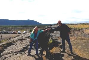 We moeten vandaag weer terug naar Egilstadir is het oosten. We bezoeken voor het laatst het prachtige meer van Myvatn. Na lang zoeken vinden we de plek waar de twee aardschollen Amerika en Europa elkaar raken. In 2007 hebben we hier een leuke foto genomen van Mariët en Ien, die elk op een werelddeel staan en elkaar de hand schudden. We sms-sen een foto van Ien in dezelfde pose naar Mariet met de tekst "Mariët, waar ben je ?????". Het Elfenwoud op zijn mooist Als afsluiting van dit gebied bezoeken we nog even het elfenwoud en lopen het romantische paadje naar de elfenrotsen. De rotspunten liggen er in het zonnetje schitterend bij. Samen met het groene water een superplaatje! Een perfecte afsluiting van het Myvatn gebied.